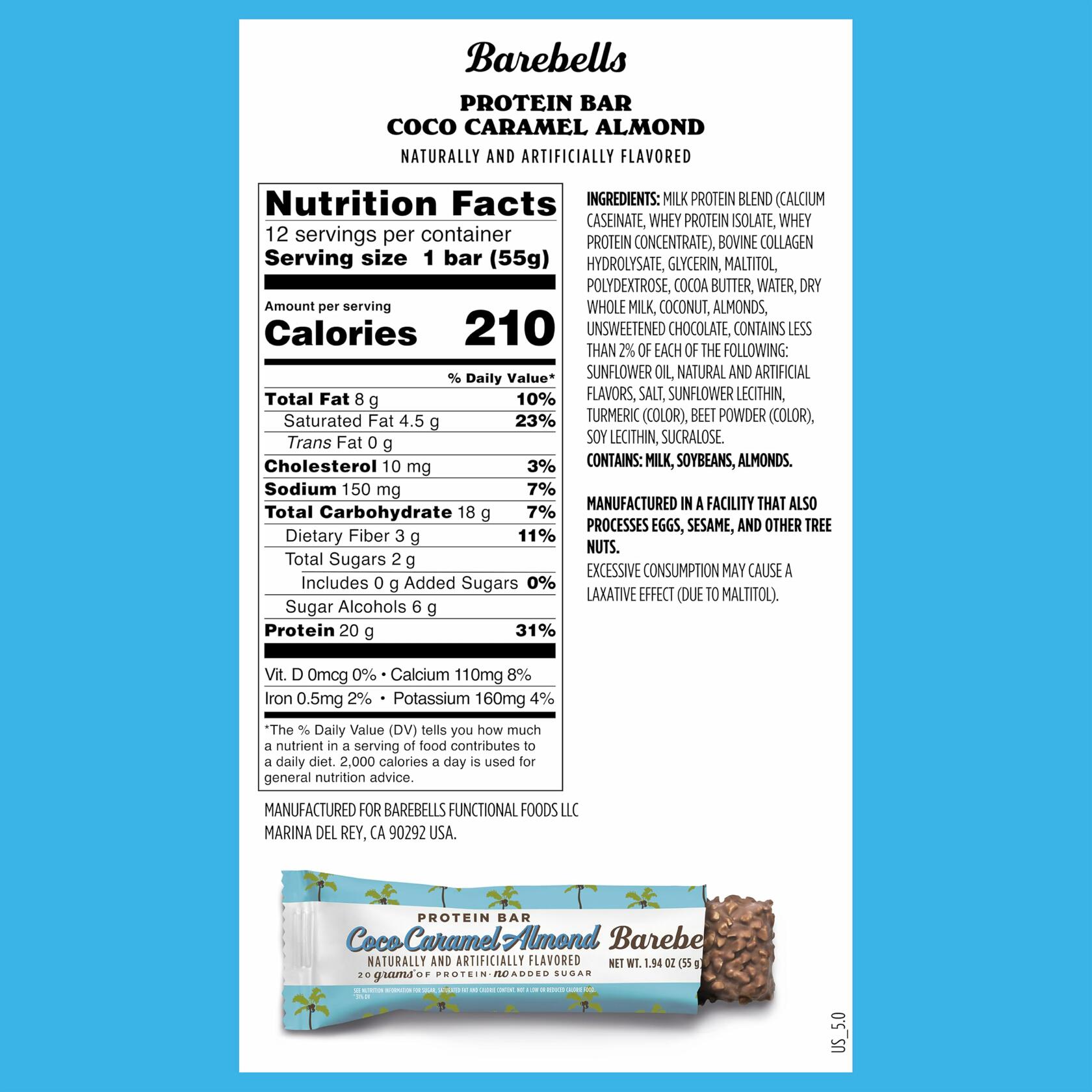- BAREBELLS COCONUT CARAMEL ALMOND BAR - 12 individual yummy Barebells protein bars! Barebells Coconut Caramel Almond features a soft, coconut caramel almond-flavored inner coated in milk chocolate.