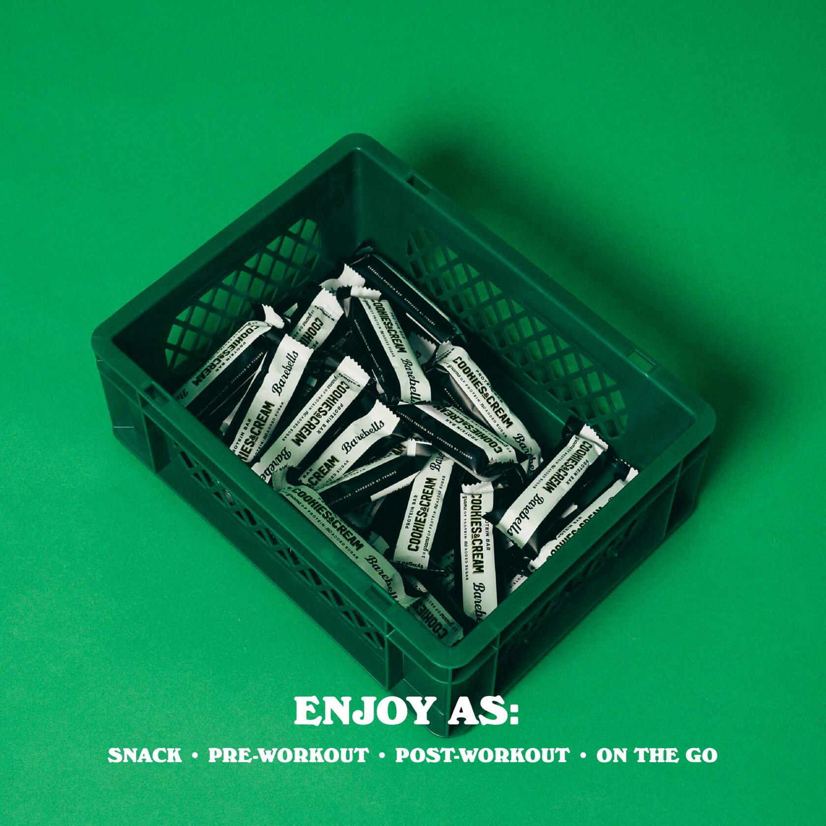 - BAREBELLS COOKIES & CREAM PROTEIN BAR - 12 individual yummy Barebells protein bars! Tired of eating bars that taste like cardboard? Cookies and Cream is the classic flavor is inspired by the most loved American cookies, this bar is sure to satisfy any crazy cookie cravings. The cherry on top; Cookies and Cream has 20 grams of protein and *no added sugar. This protein bar is your perfect post-workout snack!