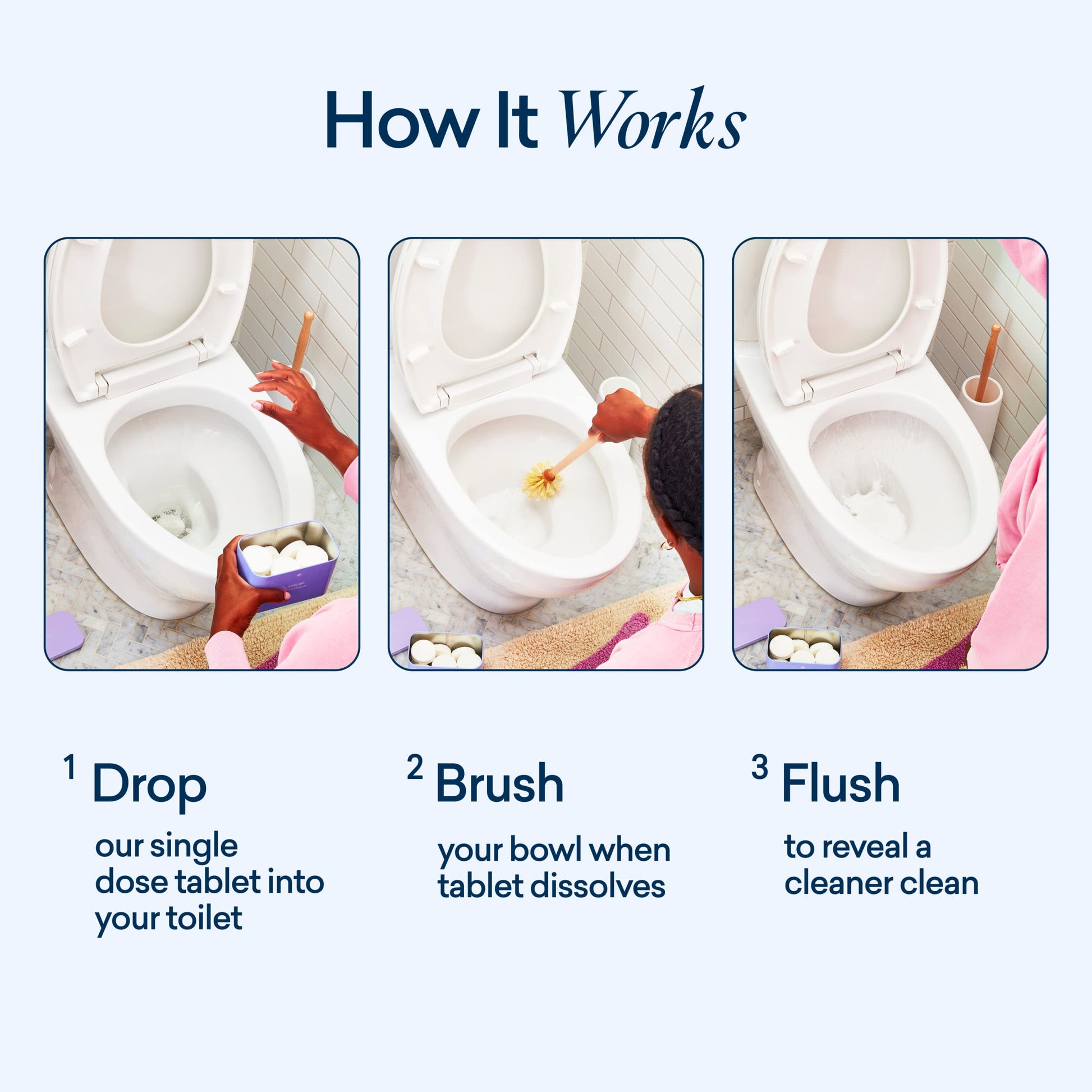 - EASY TO USE: Just Drop, Brush, and Flush. Drop a tablet into your toilet bowl and watch it fizz and foam. Give your bowl a quick brush once it's dissolved. and Flush your newly cleaned toilet and admire the shine!