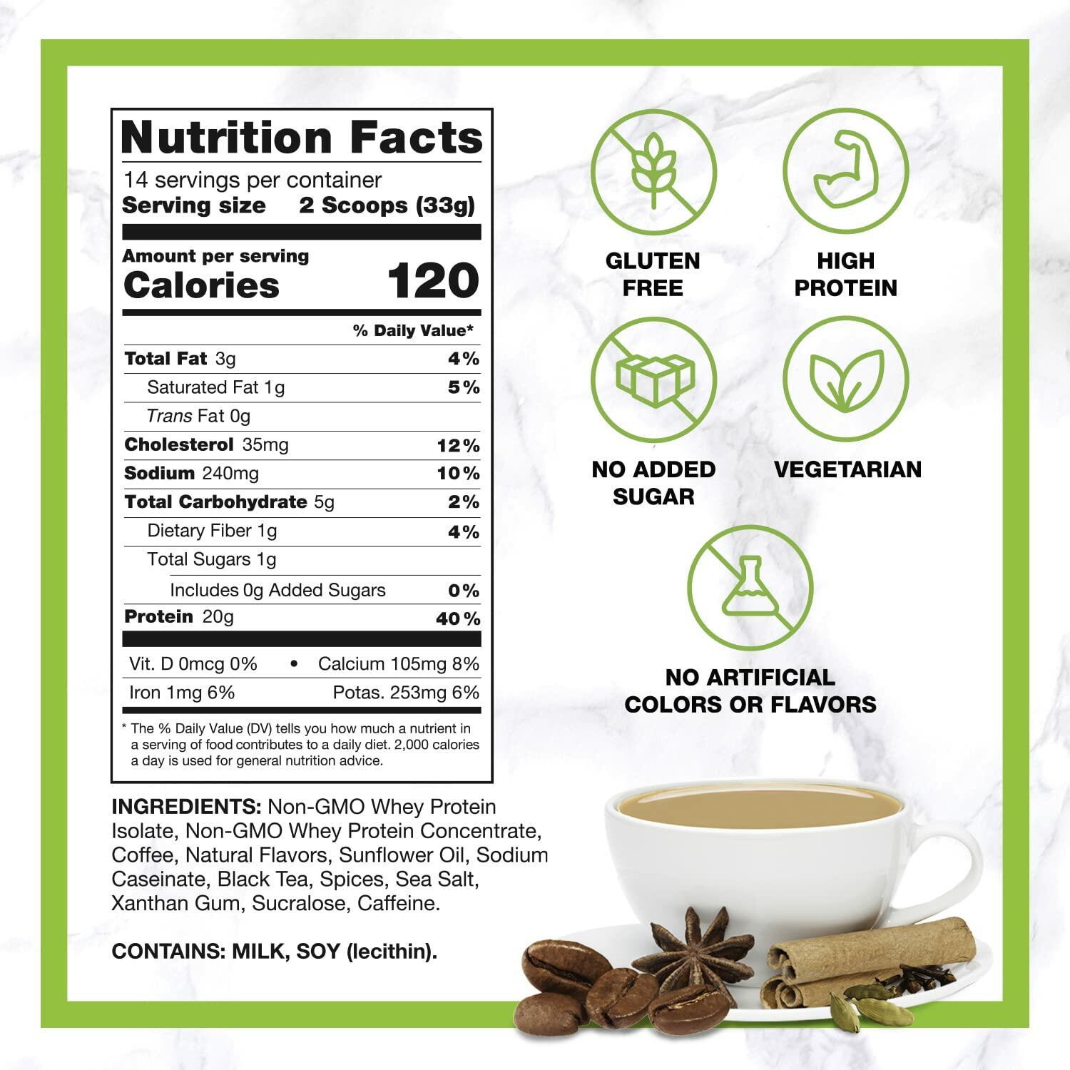 - CHAI TEA PLUS PROTEIN - Each serving contains 150mg of caffeine with real black tea and espresso and 20 grams of non-GMO whey protein.