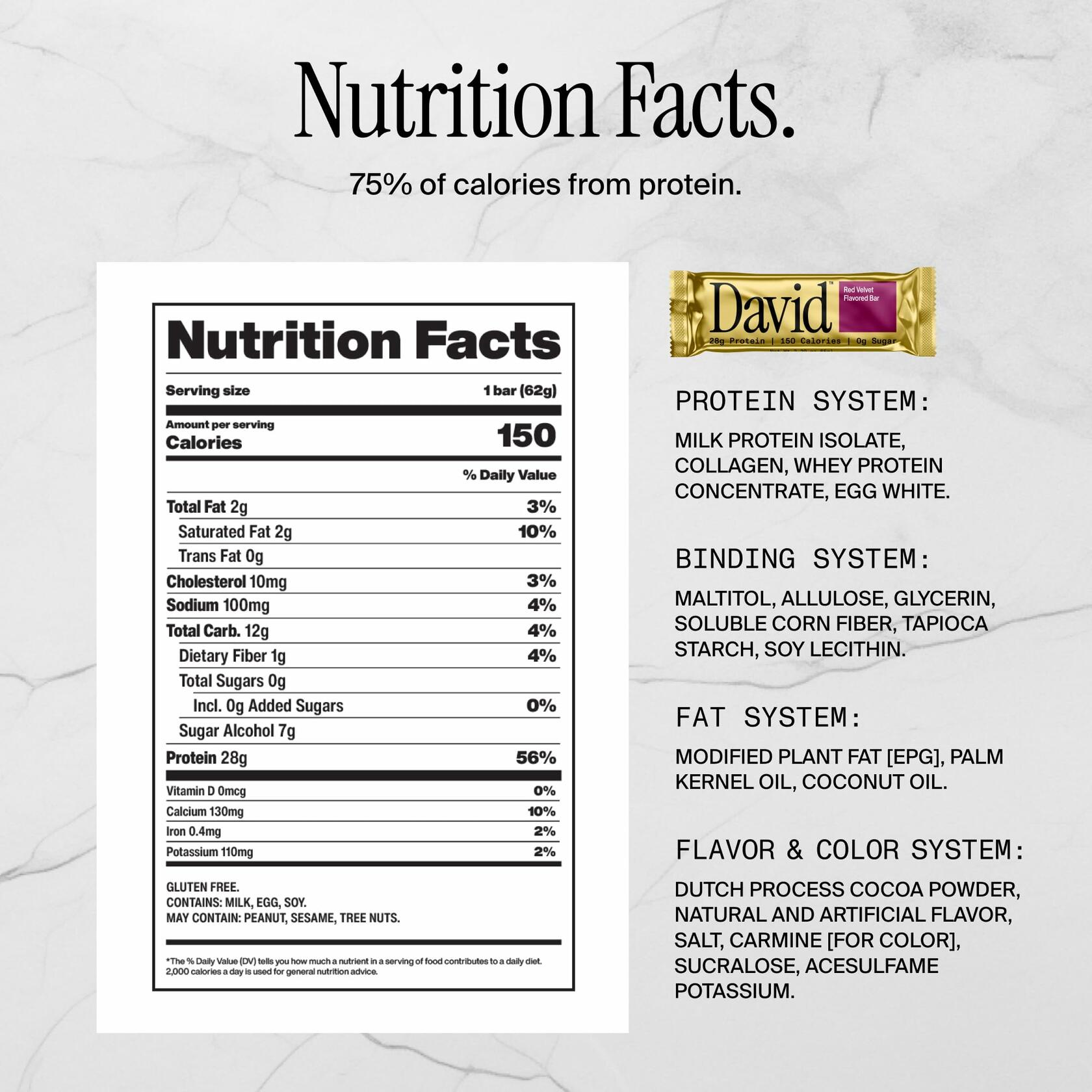 David High Protein Bars No Sugar - Sugar Free Protein Bars, Low Carb, Gluten Free - 28g of Protein, 150 Calories - David Bar On-The-Go Snack - Red Velvet, Pack of 12