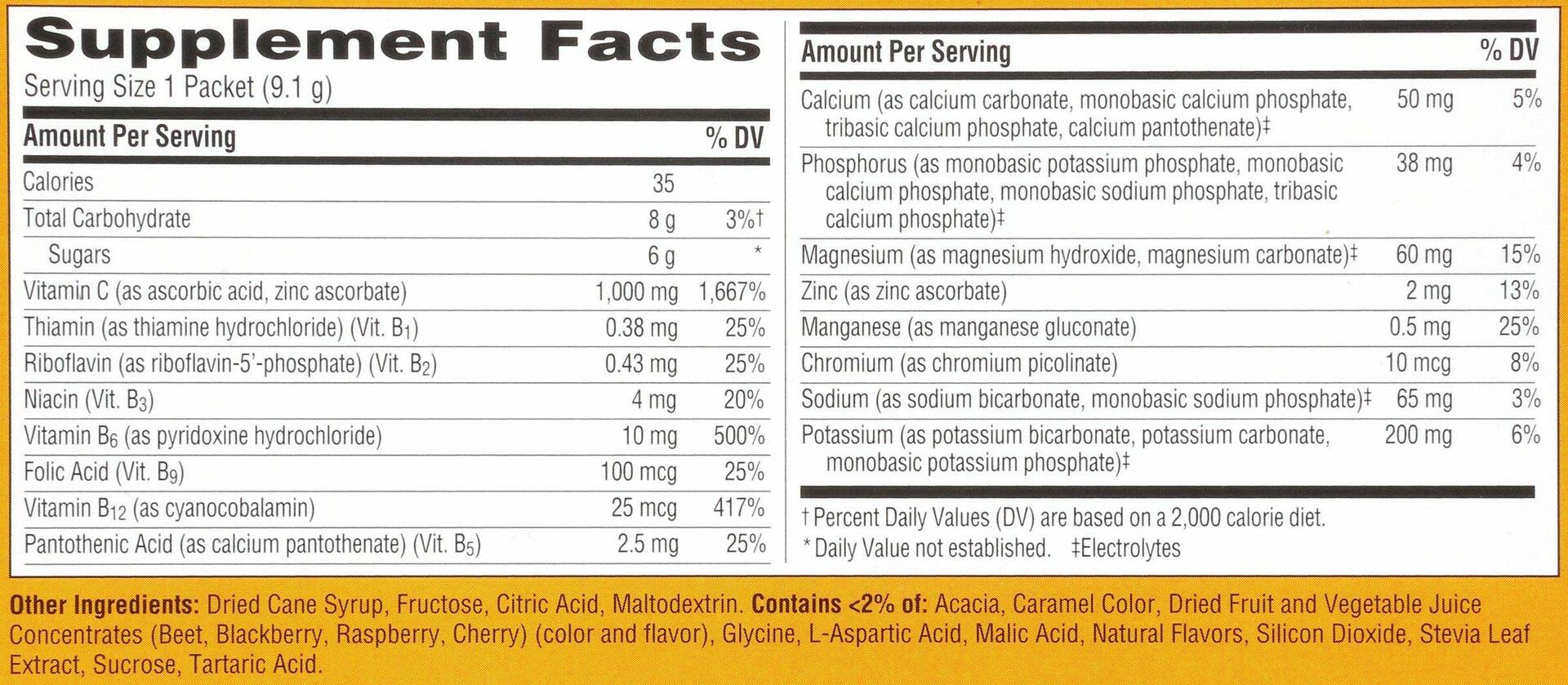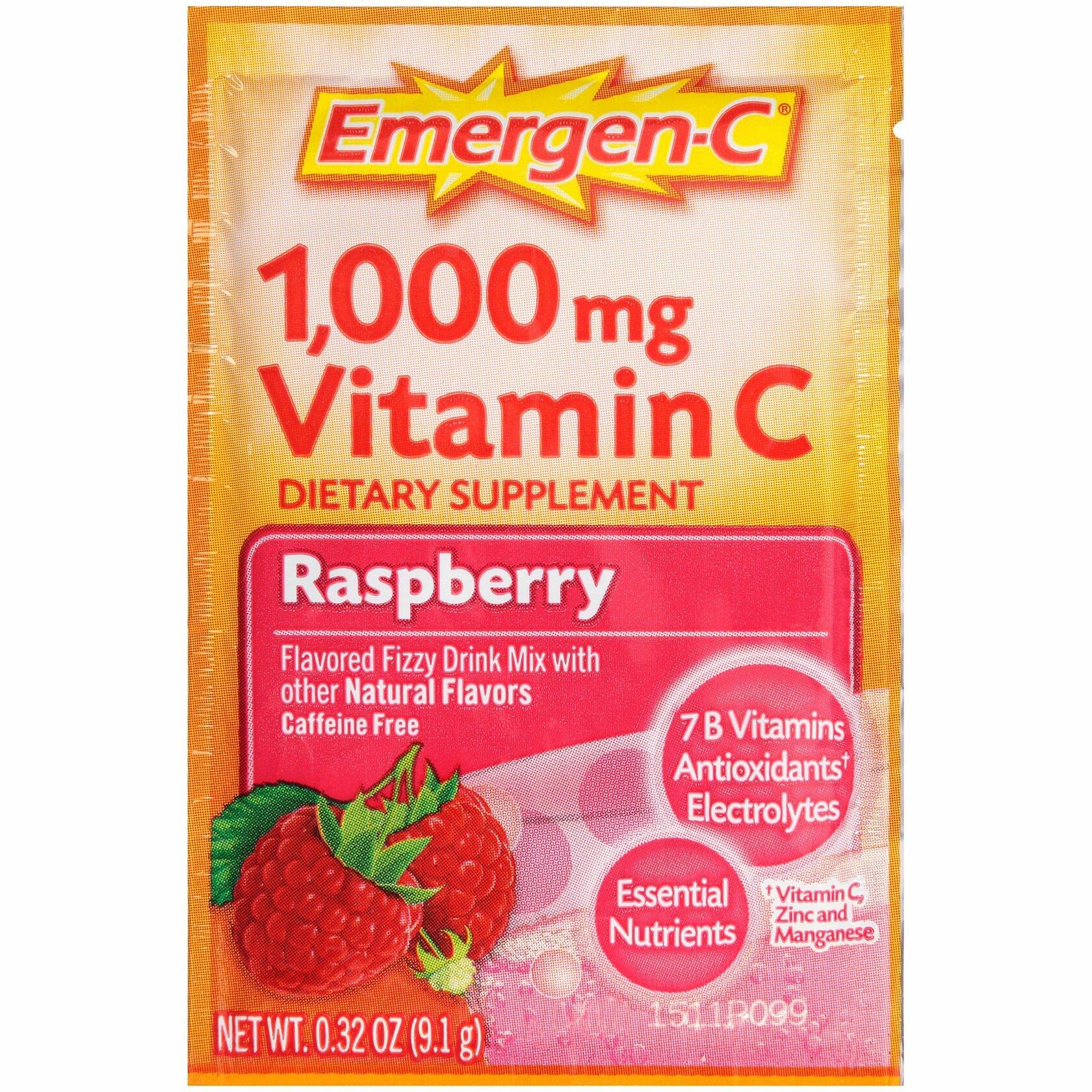 Emergen-C Raspberry delivers a fizzy, delicious dose of daily immune support in every packet, with 1,000 mg of Vitamin C plus zinc and manganese to help support your immune system and antioxidants to help fight free radicals. This caffeine-free dietary supplement features a fruity raspberry flavor made with natural fruit flavors and sweeteners. Packed with 7 essential B vitamins for natural energy support and vital electrolytes for hydration, Emergen-C is your go-to blend for immune, energy, and overall wellnesswhether at home or on the go. Simply mix with water for a refreshing, bubbly drink thats gluten-free, vegetarian, and made with naturally sourced colors.