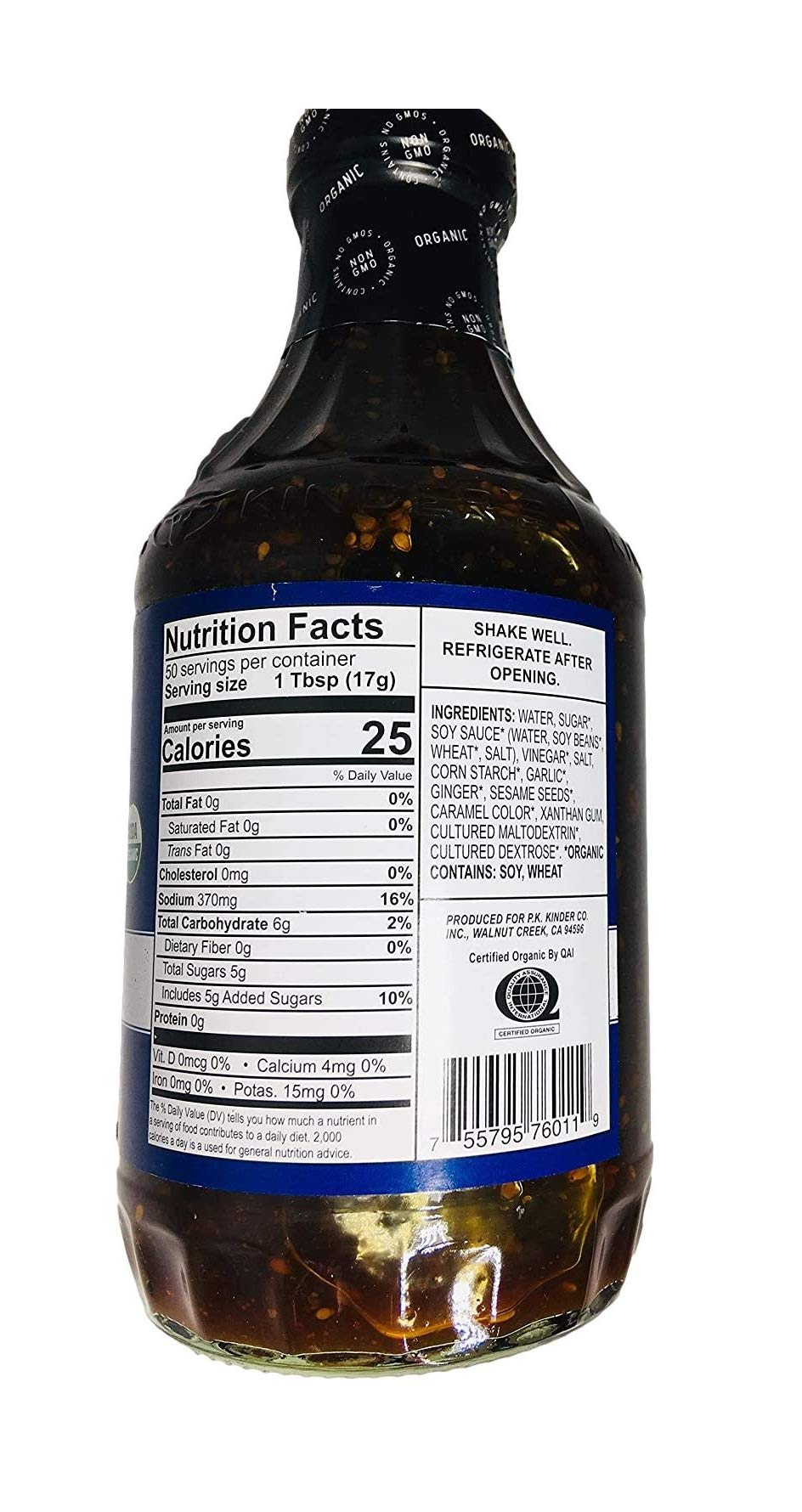 Kinder's Organic Teriyaki Marinade & Sauce, 2-Bottles N.W. (30 oz./850g) each , and with Less Sodium now, is a sweet-savory blend of delicious flavors with balanced notes of garlic and ginger, creating an exotic fusion that's perfect for any meal. Whether you are marinating or using it straight from the bottle, it works great with chicken, steak, pork, fish, and even a veggie stir fry. Kinder's Teriyaki is certified organic, bold in flavor, delicious and satisfying. Shake Well, refrigerate after Opening. Free Shipping as 2 Glass Bottles 30oz each.