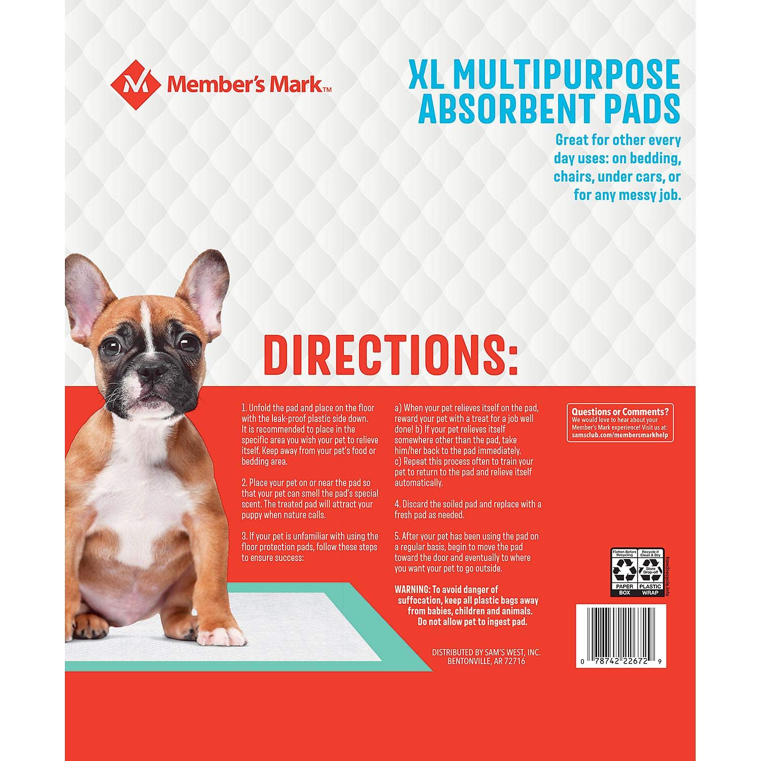 Member’s Mark pet training pads provide all day protection for puppies and dogs of all ages. These pet pads can be used at home, in pet carriages, on car seats and more. Now with a quilted CleanPaw top sheet, Member’s Mark pet training pads help prevent tracking and are even more