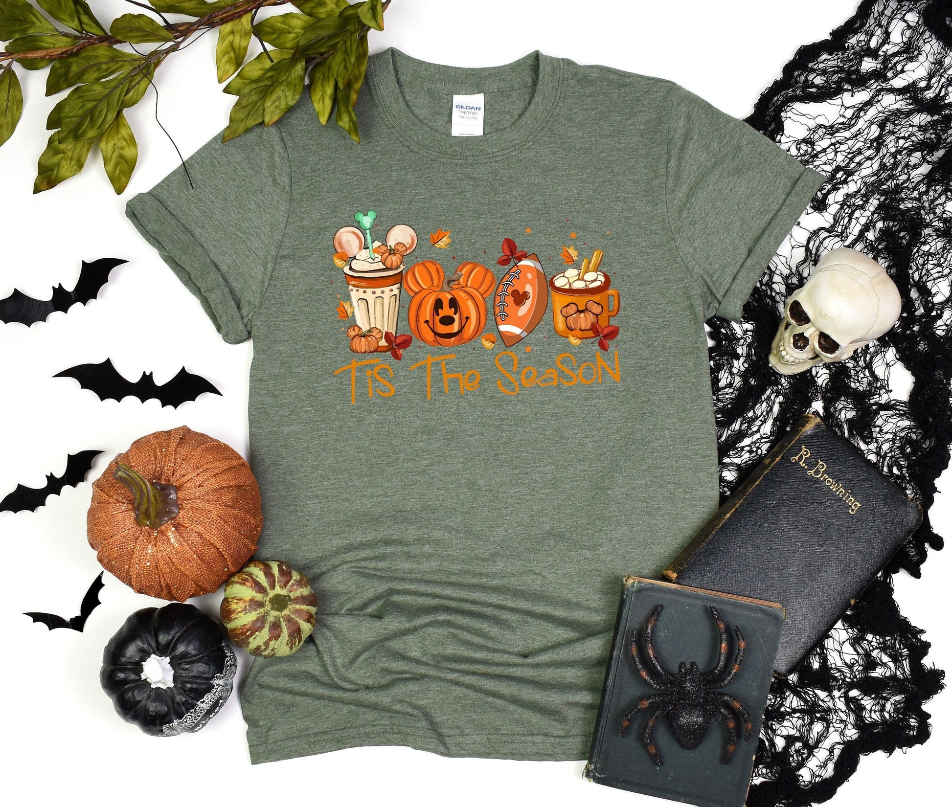 Mickey Ears Disney Halloween Coffee Tis The Season Shirt, Disney 2023 Halloween T-Shirt, Disney Fall Thanksgiving Pumpkin Football Gift Tee,