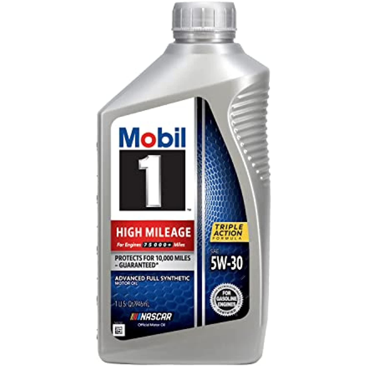 Give your higher mileage engine the care it deserves with Mobil 1 High Mileage full-synthetic motor oil 5W-30. This formula utilizes Mobil 1’s signature Triple Action Formula to deliver outstanding engine performance, protection, and cleanliness to vehicles with over 75,000 miles. Mobil 1 High Mileage motor oil extends engine life by reducing friction and preventing deposits and sludge buildup—keeping critical engine parts clean and protected for up to 10,000 miles between oil changes.* Mobil 1 High Mileage full-synthetic motor oil 5W-30 also helps control oxidation to prevent oil breakdown and is recommended by ExxonMobil for all types of modern cars, SUVs, light vans, and light trucks—including those with high-performance, turbocharged, supercharged, multi-valve, or fuel-injected engines. Mobil 1 is America’s #1 selling synthetic motor oil brand at retail,** trusted and recommended by car builders and experienced mechanics, and is the Official Motor Oil of NASCAR(R). (*Protects for up to 10,000 miles or 1 year, whichever comes first. ** Source: The NPD Group/ Retail Tracking Service/ Dollar Sales/ PCMO full-synthetic/ 52 weeks ending Aug 28, 2021)