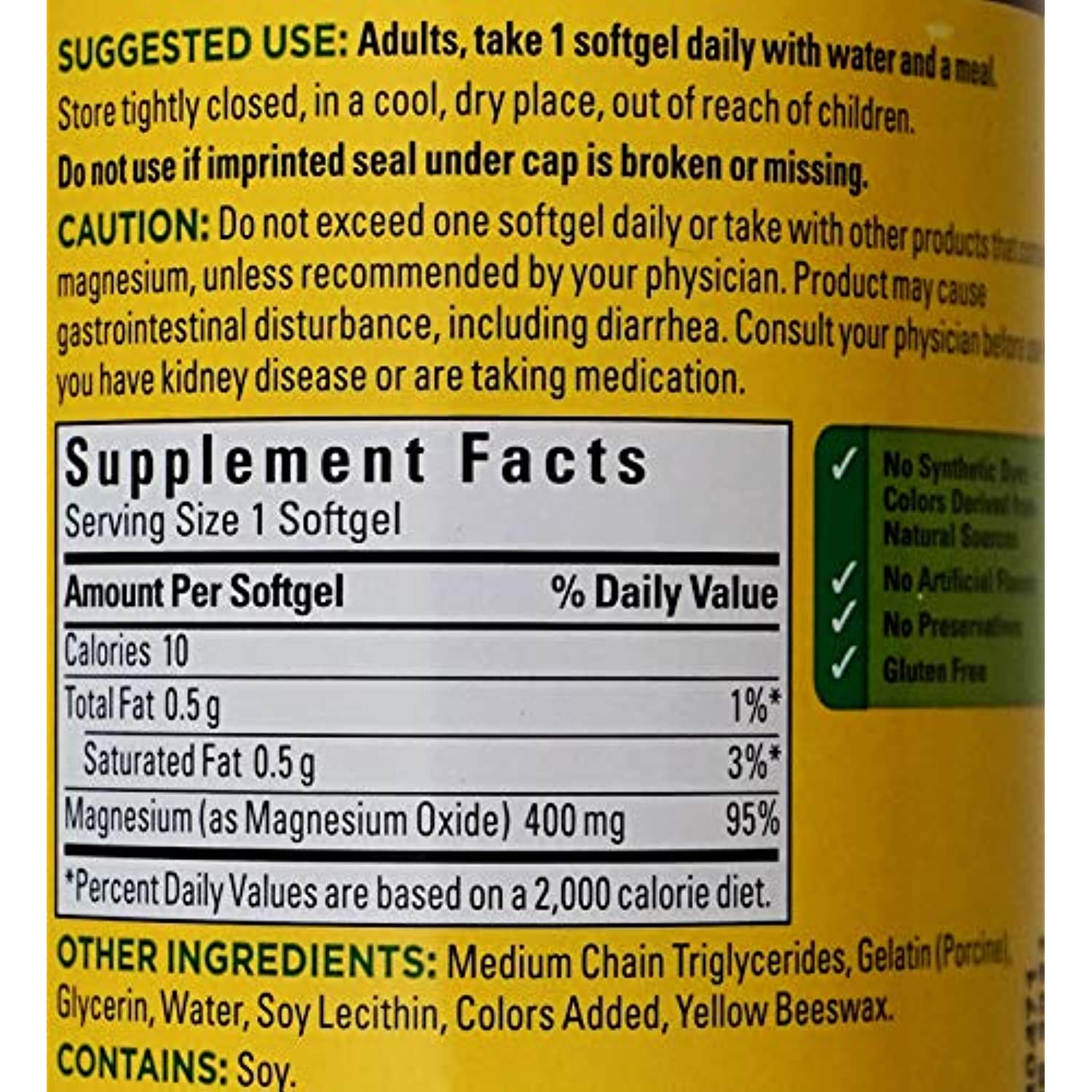 *Supports Nerve, Muscle, Heart and Bone Health. *Magnesium 400mg Per Softgel. *Gluten-Free. No Preservatives. No Artificial Flavors. No Synthetic Dyes. *Made in USA. *Size: 180 Softgels Each Bottle.