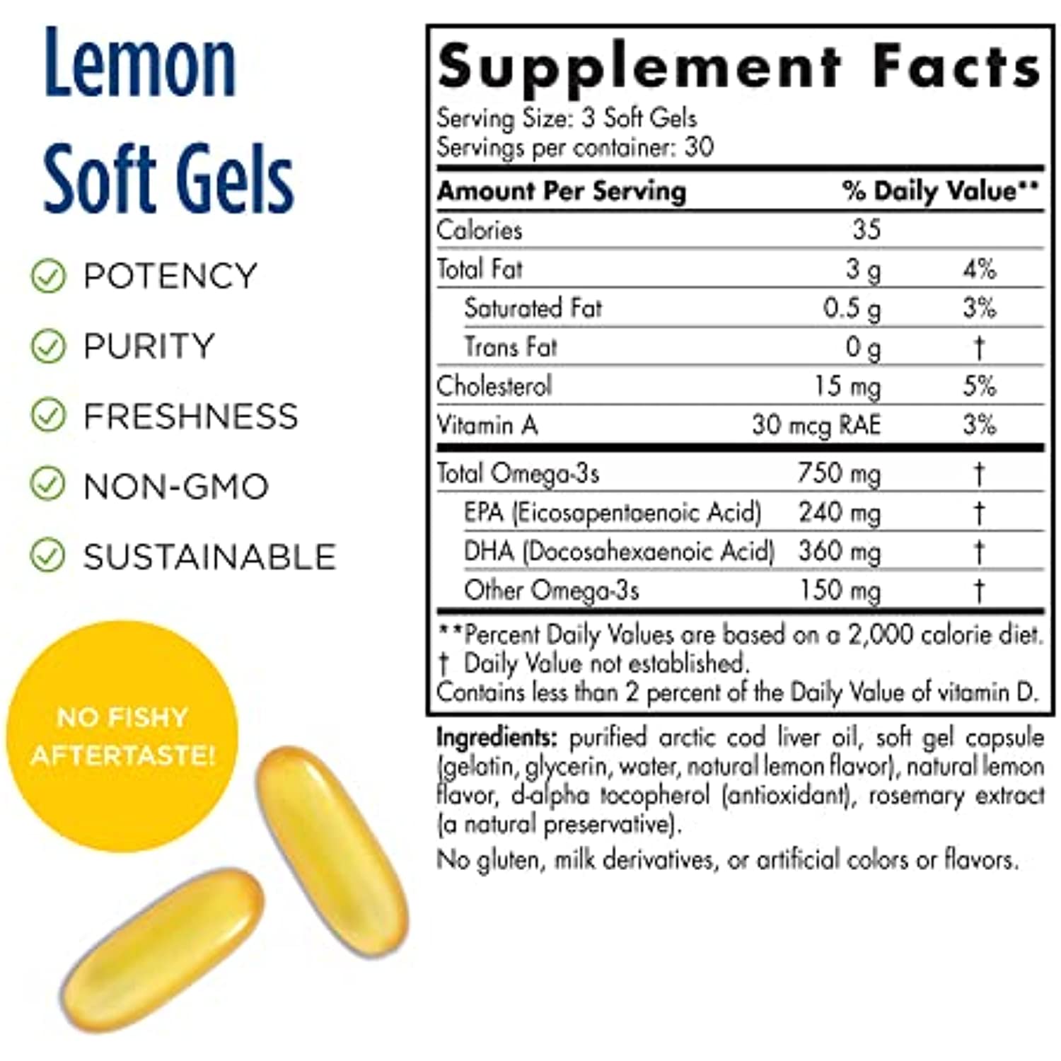 Nordic Naturals Arctic Cod Liver Oil, Lemon - 90 Soft Gels - 750 mg Total Omega-3s with EPA & DHA - Heart & Brain Health, Healthy Immunity, Overall Wellness - Non-GMO - 30 Servings