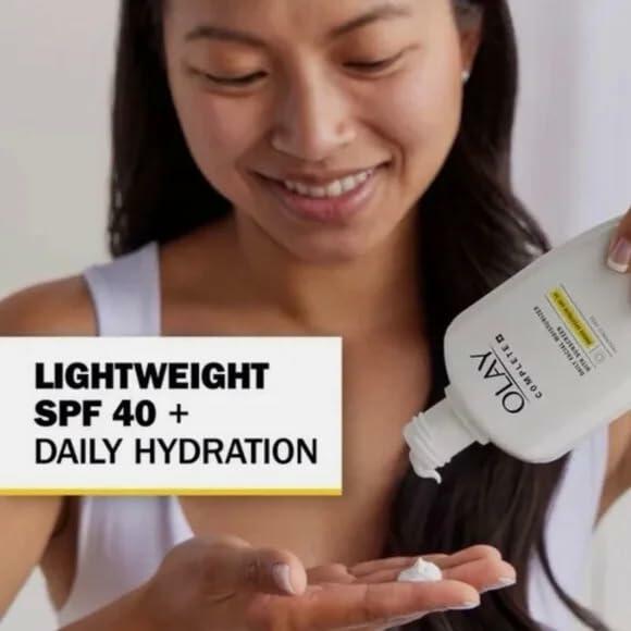 Hydrate your skin while protecting it from the sun with Olay Complete+ Daily Facial Moisturizer with Sunscreen. This 2-in-1 moisturizer and sunscreen offers deep hydration to nourish your skin while providing broad spectrum SPF 40 protection against harmful UVA and UVB rays. It leaves a lightweight, matte finish without greasy residue or a white cast, making it as easy to apply as brushing your teeth. Complete+ Daily Facial Moisturizer is designed to protect, nourish, and renew your skin’s moisture barrier. It features a gentle, soothing formula that is dermatologically approved by the Skin Health Alliance and is ideal for sensitive skin. This fragrance-free, non-comedogenic moisturizer is free from mineral oil, phthalates, parabens, and synthetic dyes, ensuring it is suitable for anyone's sun skincare routine. This lotion is has nourishing ingredients including Ceramides, Niacinamide, and Vitamin E to strengthen your skin’s natural moisture barrier. In fact, 98% of consumers prefer Complete+ over the leading SPF moisturizer, based on the past 12 months of xAOC sales data. Experience the care your skin needs, all in a recyclable bottle.Did you know the sun causes hidden damage even on cloudy days? This is the lead cause of pre-mature aging. Sun protection is needed every day.? Olay Complete Collection features 2-in-1 solutions of moisturization and hydration in one step as easy as brushing your teeth?. For no white cast sun protection try Complete, which features SPF levels ranging from 15 to 40.