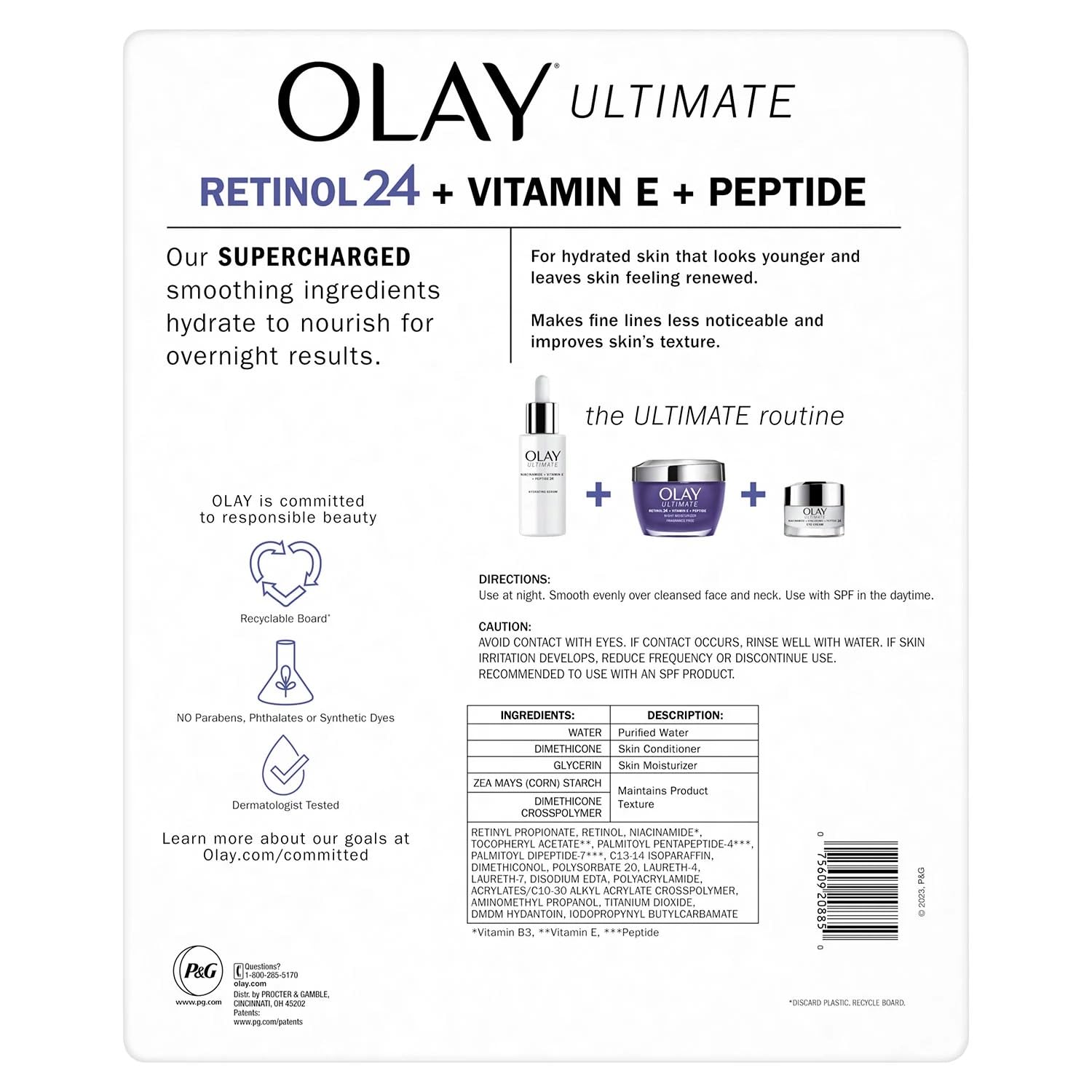 Supercharged for smooth skin overnight. Olay Ultimate Retinol 24 + Vitamin E + Peptide Night Moisturizer penetrates deep into skins surface layers. Our proprietary blend hydrates skin for 24 hours.