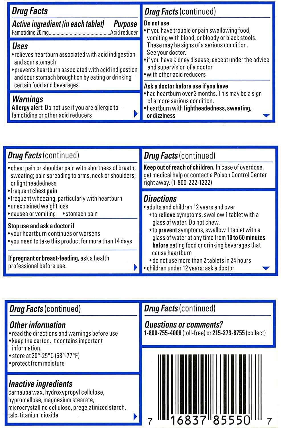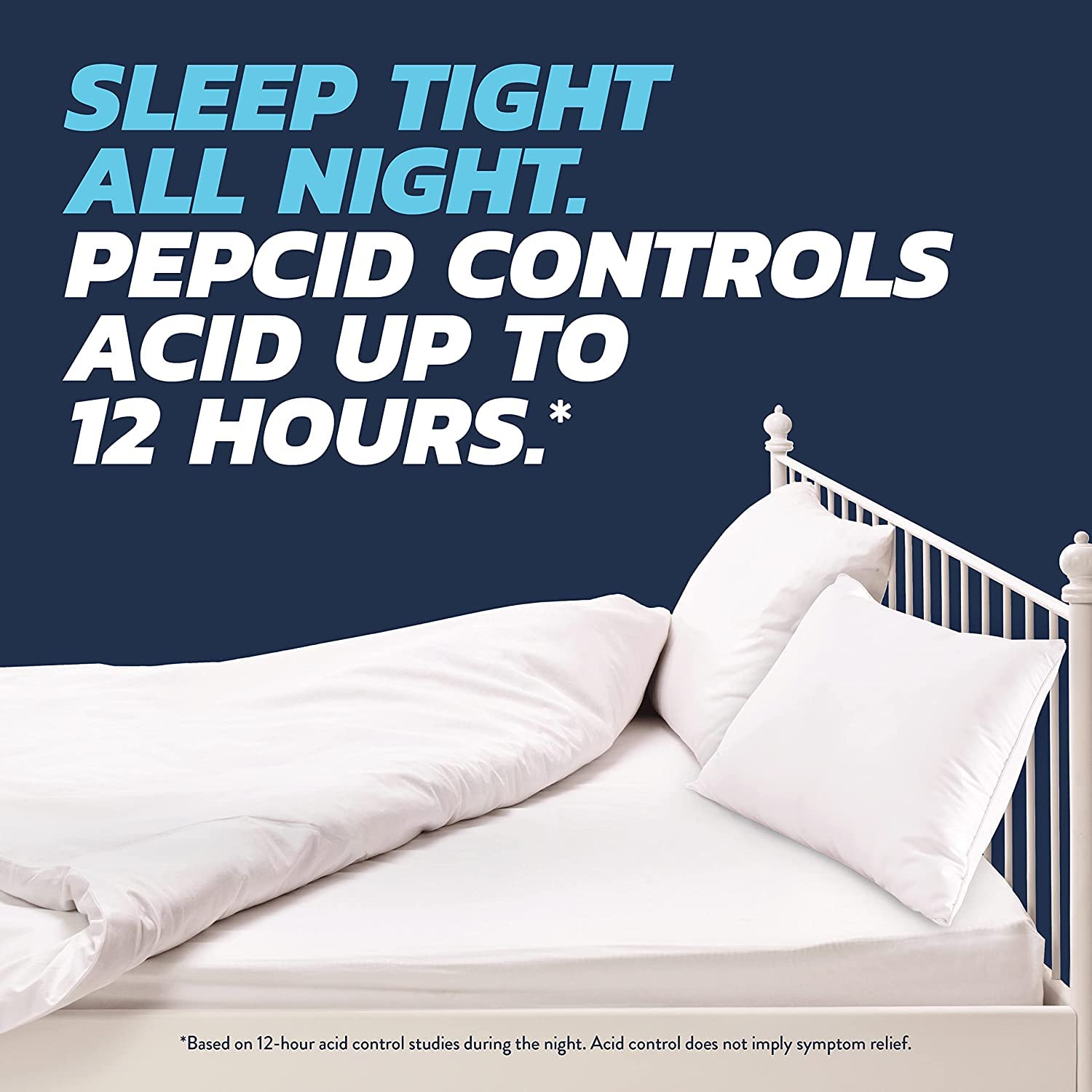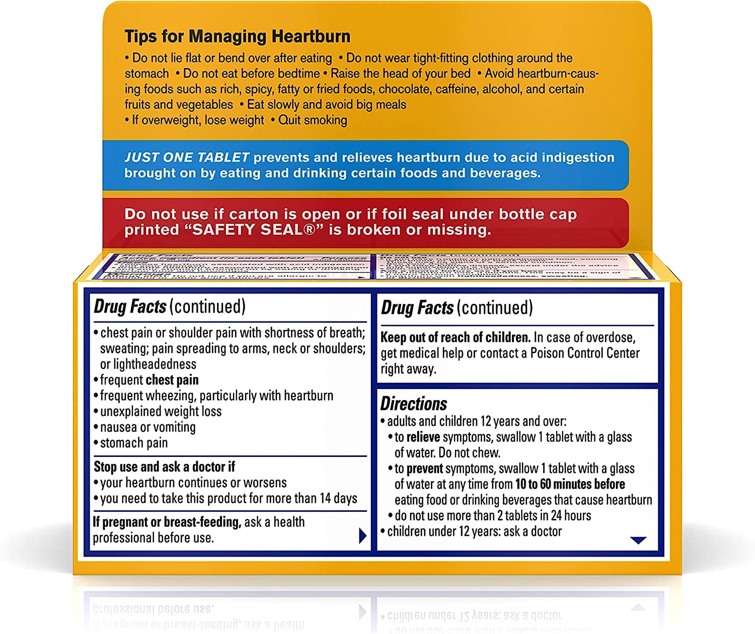 Pepcid AC Acid Reducer Maximum Strength Tablets, 100-Count. Ingredients:Maximum Strength PEPCID AC Tablets Active ingredient (in each tablet) Purpose Famotidine 20 mg Acid reducer Halt heartburn in its tracks with these maximum strength tablets. The 100 tablets reduce acid to help you stay comfortable at meal time or later. Just take 1 tablet when you know heartburn is about to hit or when it already has for relief. Do not use if you are allergic to famotidine or other acid reducers Do not use if you have trouble or pain swallowing food, vomiting with blood or bloody or black stools; these may be signs of a serious condition; see your doctor Do not use if you have kidney disease, except under the advice and supervision of your doctor Do not use with other acid reducers Ask a doctor before using if you have had heartburn for over 3 months, if you experience lightheadedness, sweating or dizziness, frequent chest pain, frequent wheezing, unexplained weight loss, nausea or vomiting, or stomach pain Stop using and ask your doctor if your heartburn continues or worsens, or if you need to take this product for more than 14 days If pregnant or breast-feeding, ask a health professional before using Keep out of reach of children