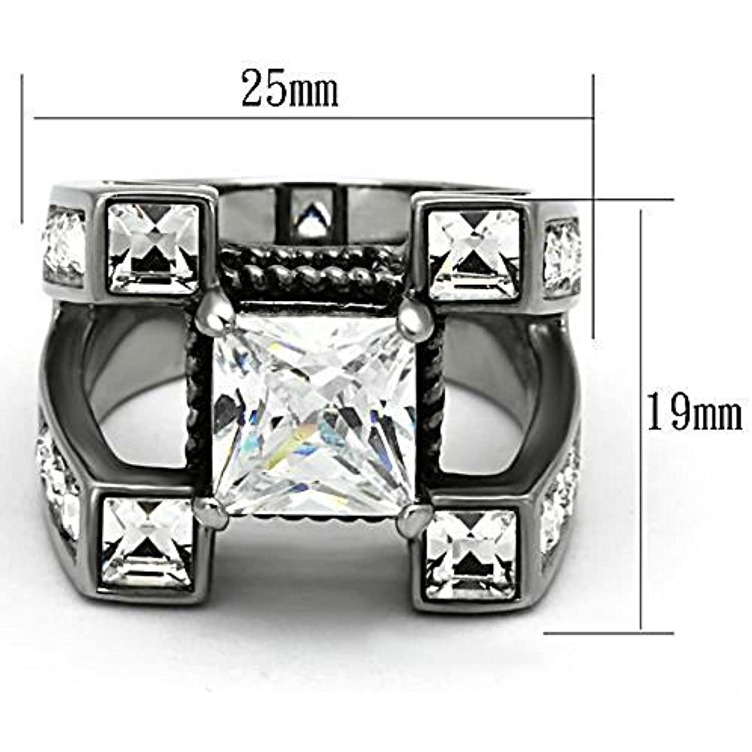 Men's large AAA Grade Cubic Zirconia ring. Features a 4.12 Ct (9x9mm) princess cut center stone, surrounded by 16 smaller stones. Total carat weight is approx 5.70 diamond equivalent. Top quality stones display enriched clarity just like real diamond! Surgical Stainless Steel Tusk 316 is durable, hypo-allergenic and will not oxidize or tarnish over time. Includes gift box for giving or storage! Top quality craftsmanship, will NOT tarnish or discolor, guaranteed! Visit our store for more men's jewelry! Item: Men's Ring Metal Type: Stainless Steel 316 Finish: High Polished (no plating) Size: 8, 9, 10, 11, 12, 13 Gemstone: AAA Cubic Zirconia Stone Detail: 5.70 Ct (approx) Ring Width: 20mm top - 9mm bottom Approx Weight: 15.3 grams Item Condition: Brand New w/ gift box Your business is very important to us and we strive to provide our customers with the best care. Your positive feedback is crucial to the success of our business and we aspire to earn that by providing the best possible product and excellent customer service. If there is anything that you are unhappy about, we encourage you to contact us via email or phone call in order to solve the problems and ensure satisfied customers. Your positive feedback will be greatly valued and reciprocated. We appreciate your order and look forward to doing more business in the future.
