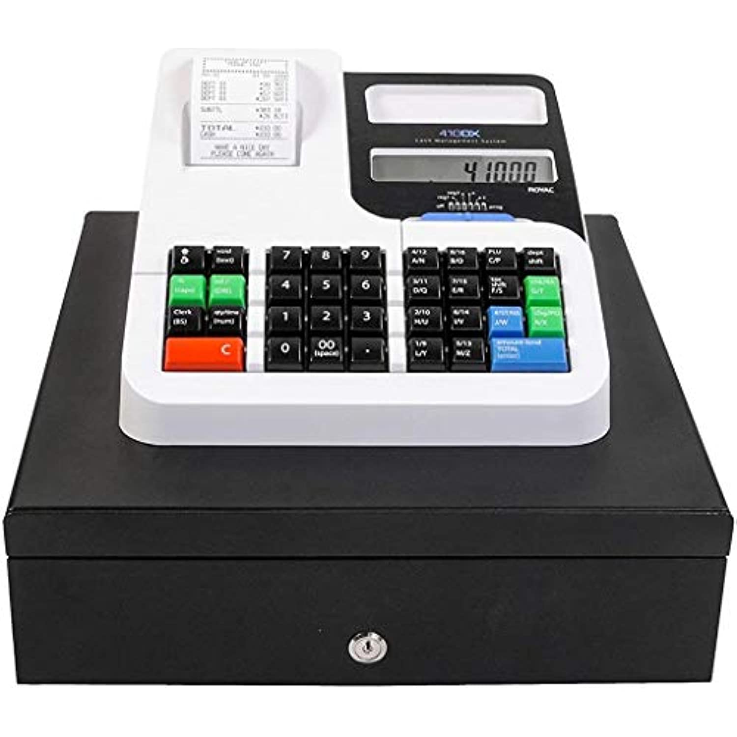The compact Royal 410DX Cash Management System utilizes a fast and quiet alphanumeric thermal printer. It features a large LCD front display and control switch. It stores up to 2,000 price lookups.