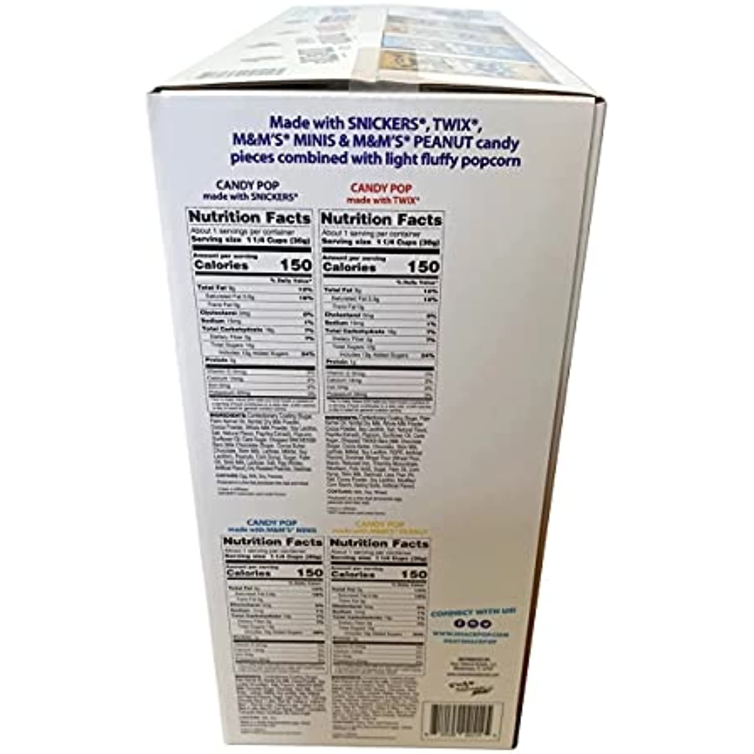 America’s favorite snacks, Snickers, Twix, M&Ms and popcorn, are teaming up to take on your taste buds. You get the delicious taste of Snickers, Twix, M&M, and peanut M&M in a light, crunchy popcorn package! It’s an incredibly satisfying combo that’s big on flavor, low in calories, and guaranteed to elevate snacking for all ages. Lightly covered popcorn that is drizzled with chocolate then covered with ground up Twix, Snickers, M&Ms candy and peanut M&Ms. Slightly indulgent popcorn that offers a balanced sweet n savory product for the whole family to enjoy. It's the perfect snack and candy flavor options for all movie night moments, back to class nourishment, lunch box prep inspiration or a fun picnic treat. The Candy Pop Popcorn snack offers a balance of sweet and savory with only 150 calories and 25 mg of sodium per 20 oz. bag serving. Try them all. Snack, share, repeat!