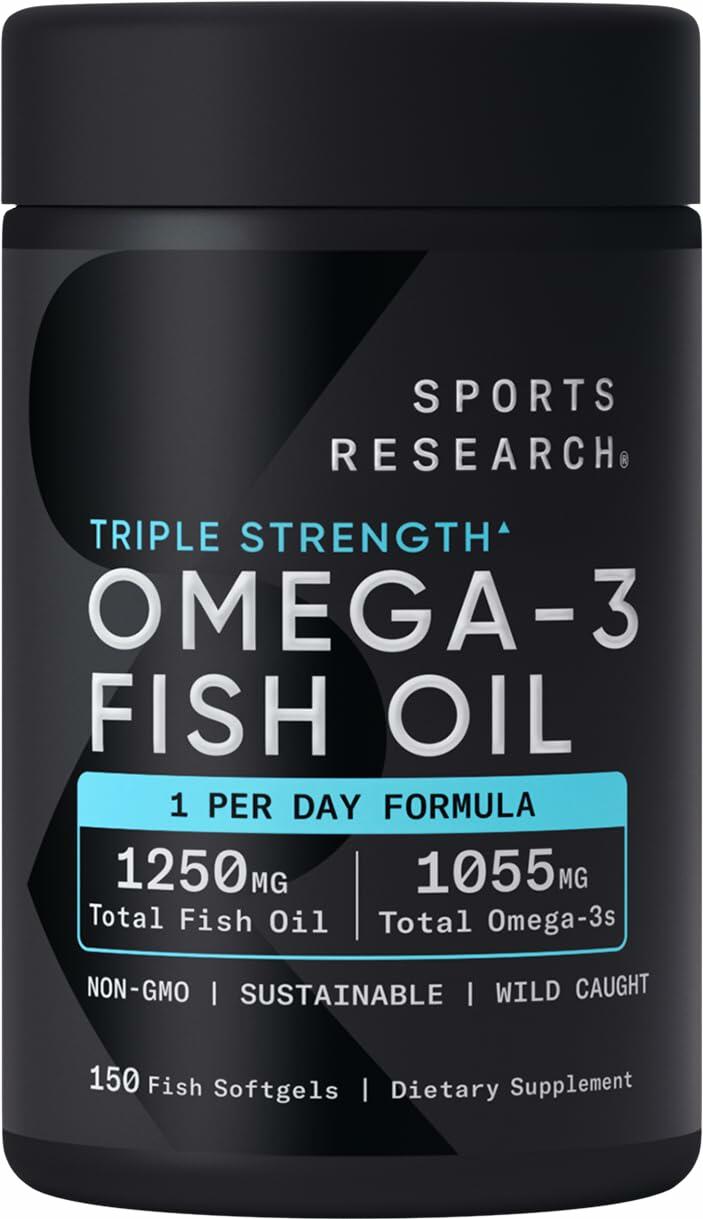 Sports Research Triple Strength Omega 3 Fish Oil - Burpless Fish Oil Supplement w/EPA & DHA Fatty Acids from Wild Caught Fish - Heart, Brain & Immune Support for Men & Women - 1250 mg, 150 ct