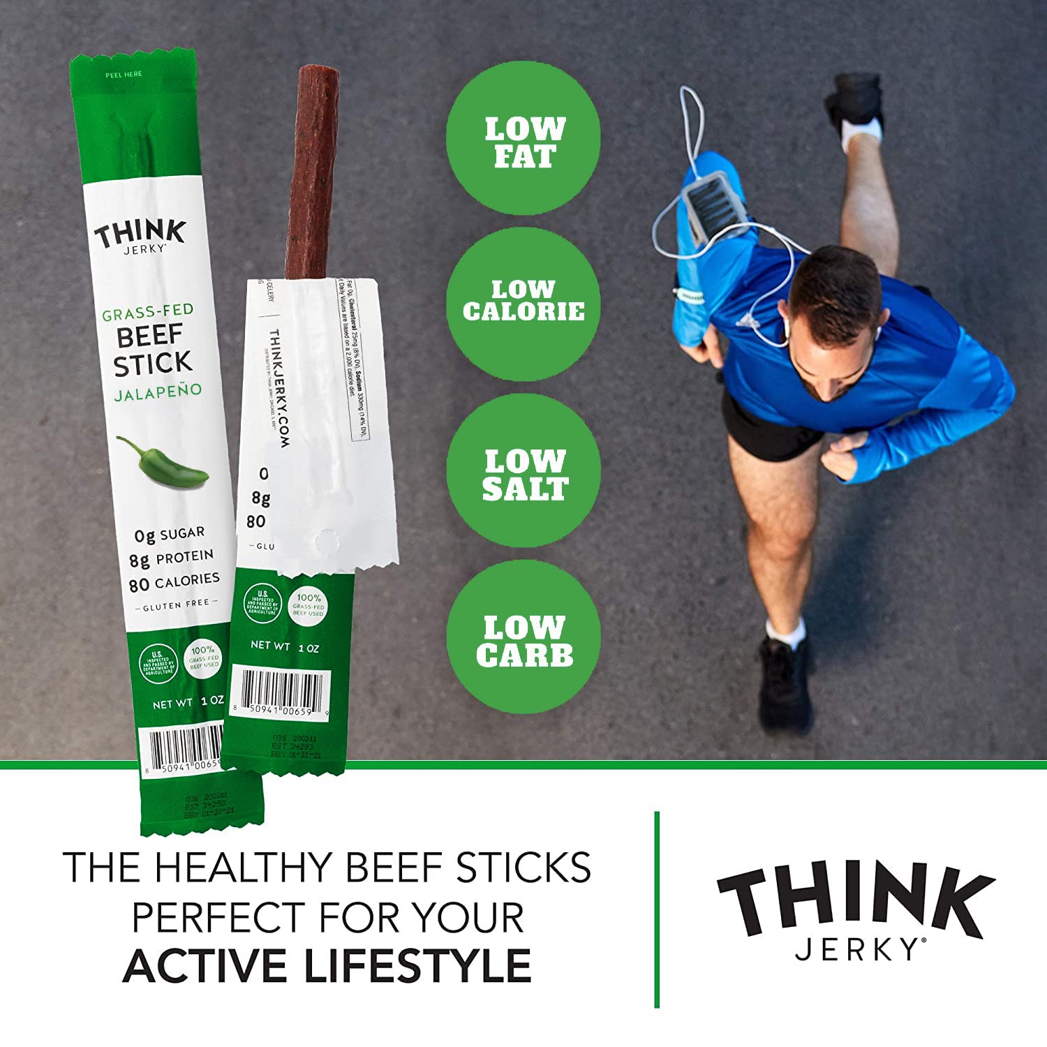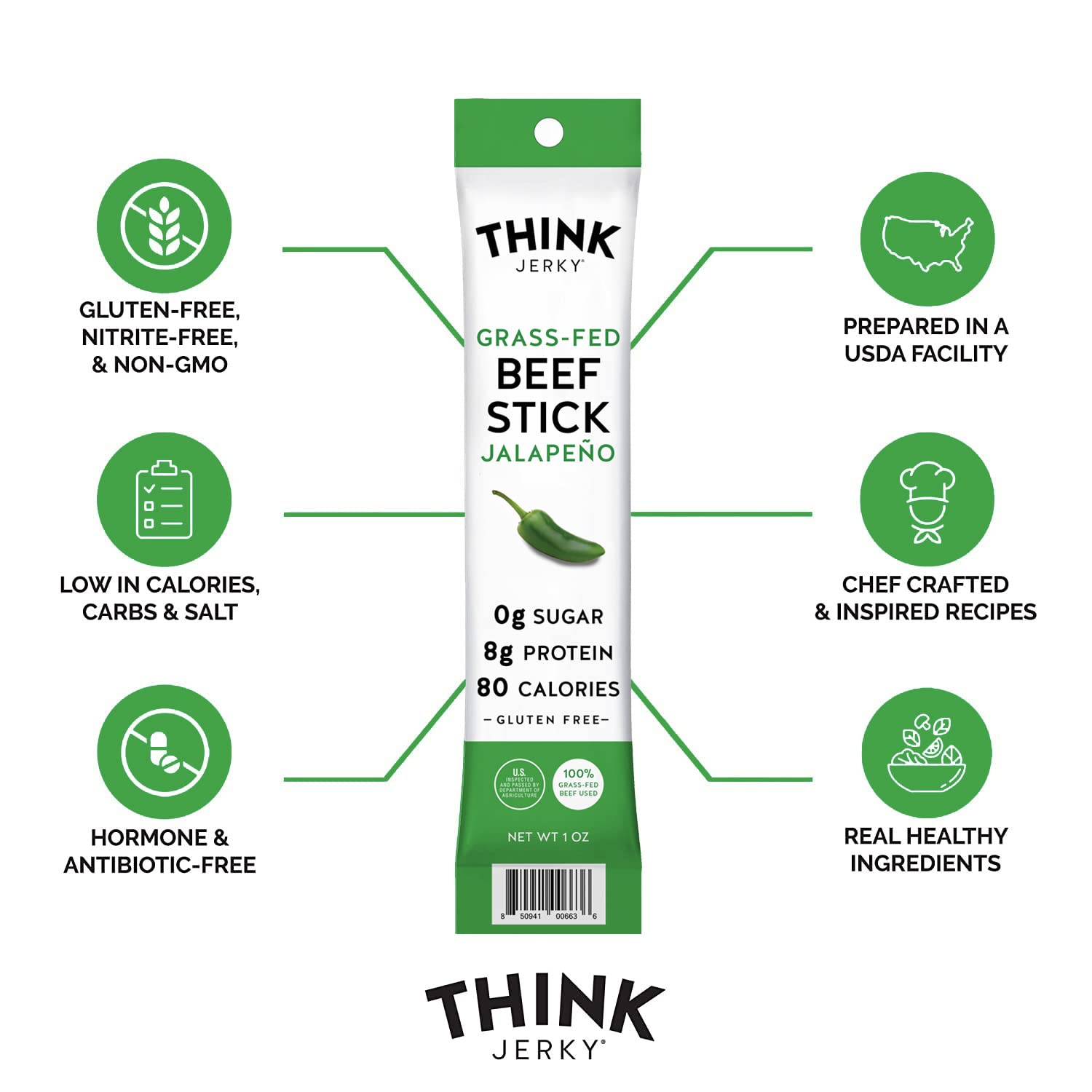Think Jerky, Jalapeno Grass-Fed Beef Sticks (1.0 Ounce Sticks, Pack of 10 Sticks) - Sugar Free, Gluten Free, Non GMO, No Nitrates, Keto Friendly, Paleo, High Protein, Low Carb