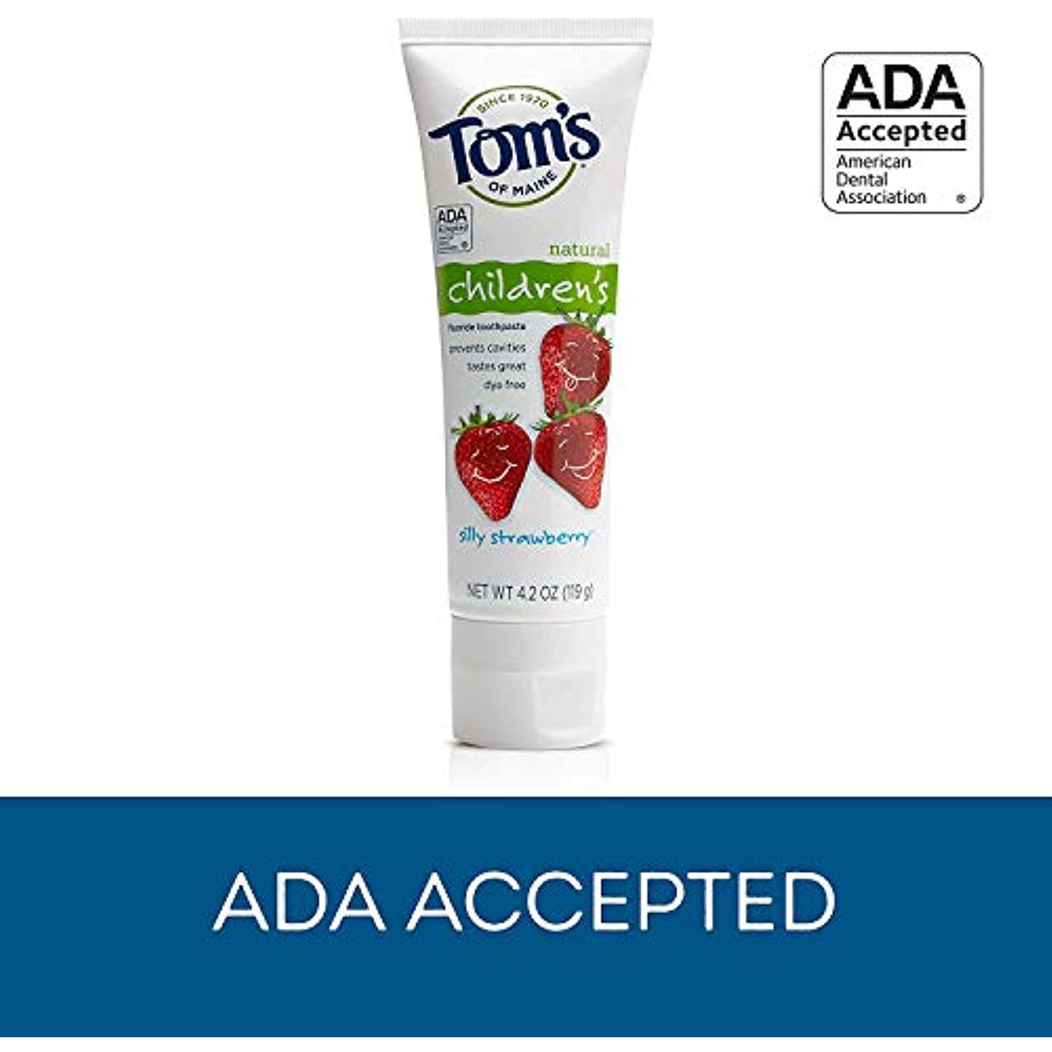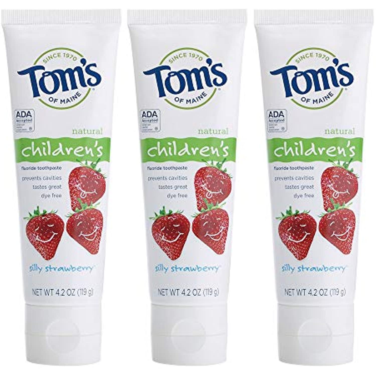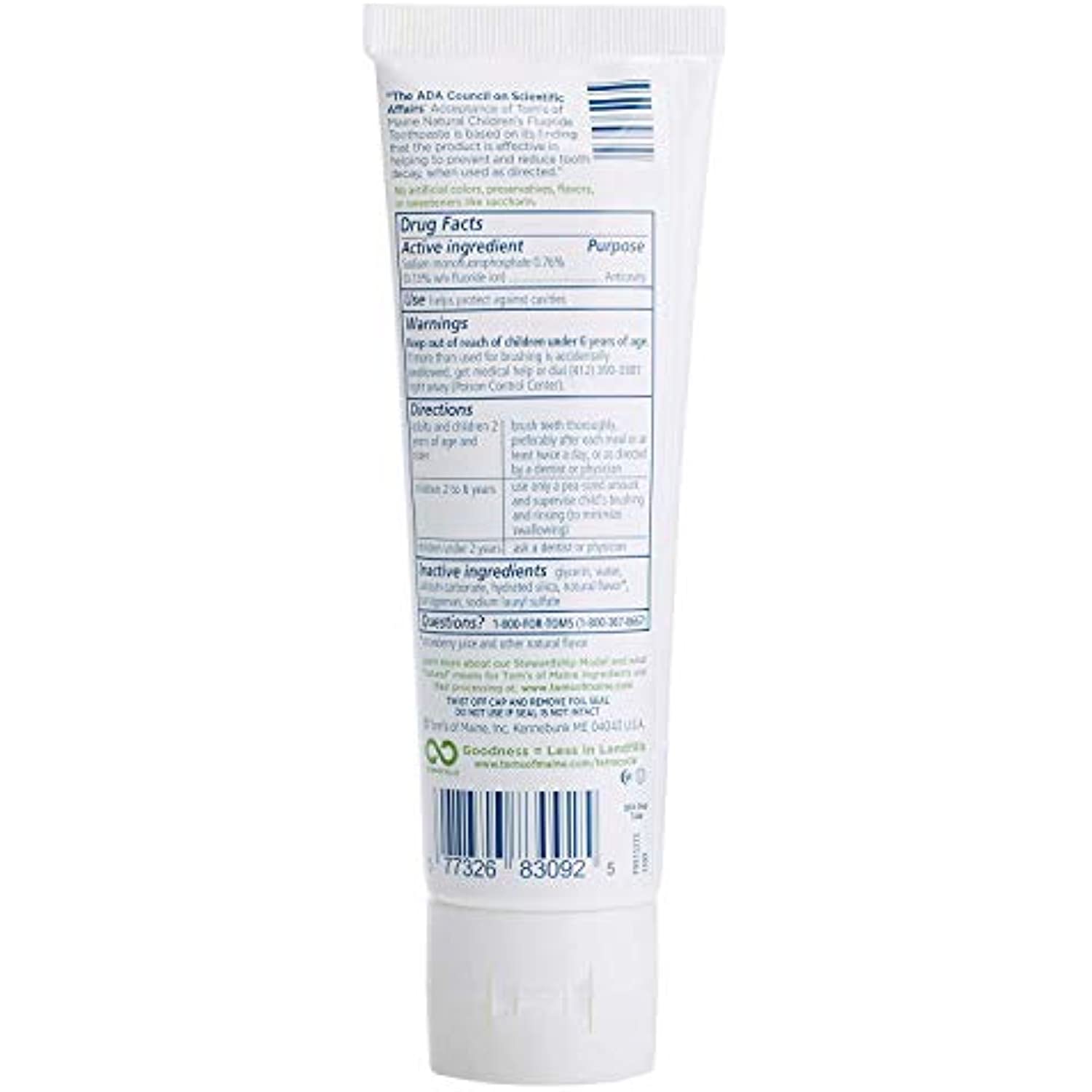 Tom's of Maine Children's Natural Fluoride Toothpaste Silly Strawberry Description: Prevents Cavities Tastes Great The ADA Council on Scientific Affairs' Acceptance of Tom's of Maine Natural Children's Fluoride Toothpaste is based on its finding that the product is effective in helping to prevent and reduce tooth decay, when used as directed. Does not contain saccharin, artificial sweeteners, preservatives, colors, flavors, or animal ingredients. No animal testing. Free Of Saccharin, artificial sweeteners, preservatives, colors, flavors animal ingredients, animal testing. Disclaimer These statements have not been evaluated by the FDA. These products are not intended to diagnose, treat, cure, or prevent any disease. Tom's of Maine Children's Natural Fluoride Toothpaste Silly Strawberry Directions Adults and children 2 years of age and older: brush teeth thoroughly, preferably after each meal or at least twice a day, or as directed by a dentist or physician. Children 2 to 6 years: use only a pea-sized amount and supervise child's brushing and rinsing (to minimize swallowing). Children under 2 years: ask a dentist or physician. Ingredients: Active Ingredient: Sodium monofluorophosphate 0.76%. Inactive Ingredients: Glycerin, water, calcium carbonate, hydrated silica, natural flavors, chondrus crispus (carrageenan), sodium lauryl sulfate. Warnings Keep out of reach of children under 6 years of age. If more than used for brushing is accidentally swallowed, get medical help or dial (412) 390-3381 right away (Poison Control Center). Dimensions: 6.68x2.33x1.47 Weight: 1.89lbs