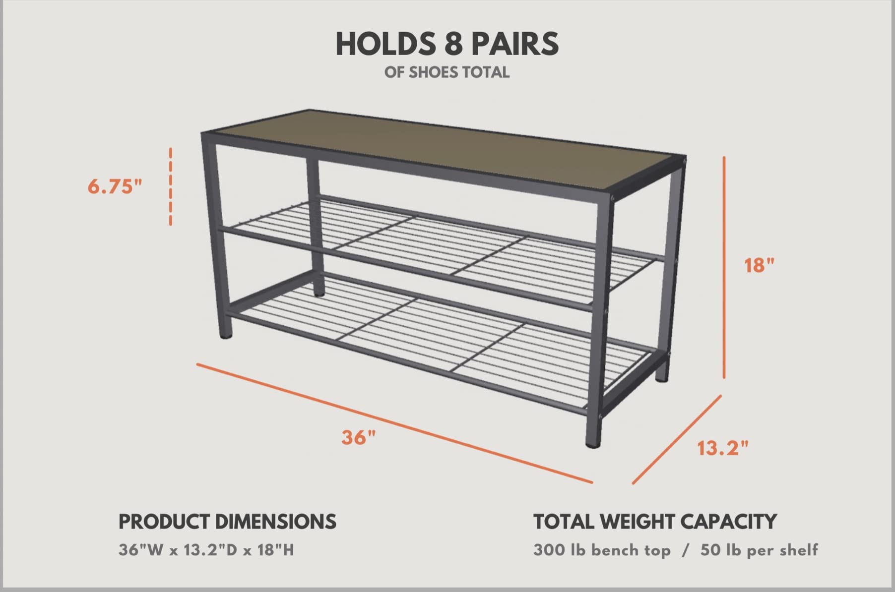 New in the box, Features: 300 lb Weight Capacity Holds 8 Pairs of Shoes Dimensions: 36”W x 13.2”D x 18”H