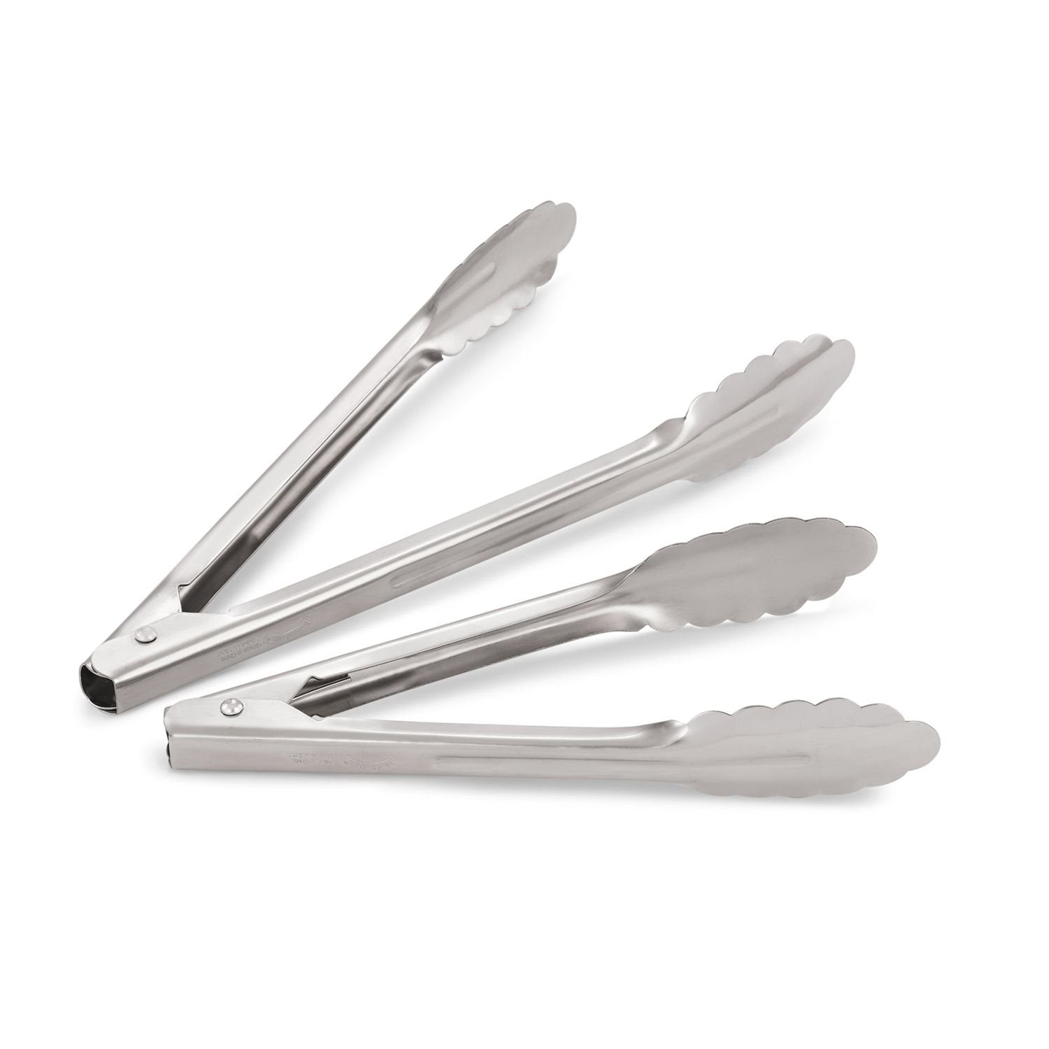 Stainless steelHeavy duty utility tongs9.5 inch and 12 inchScalloped edges provide secure grip for front and back of house applicationsHinge style tongs