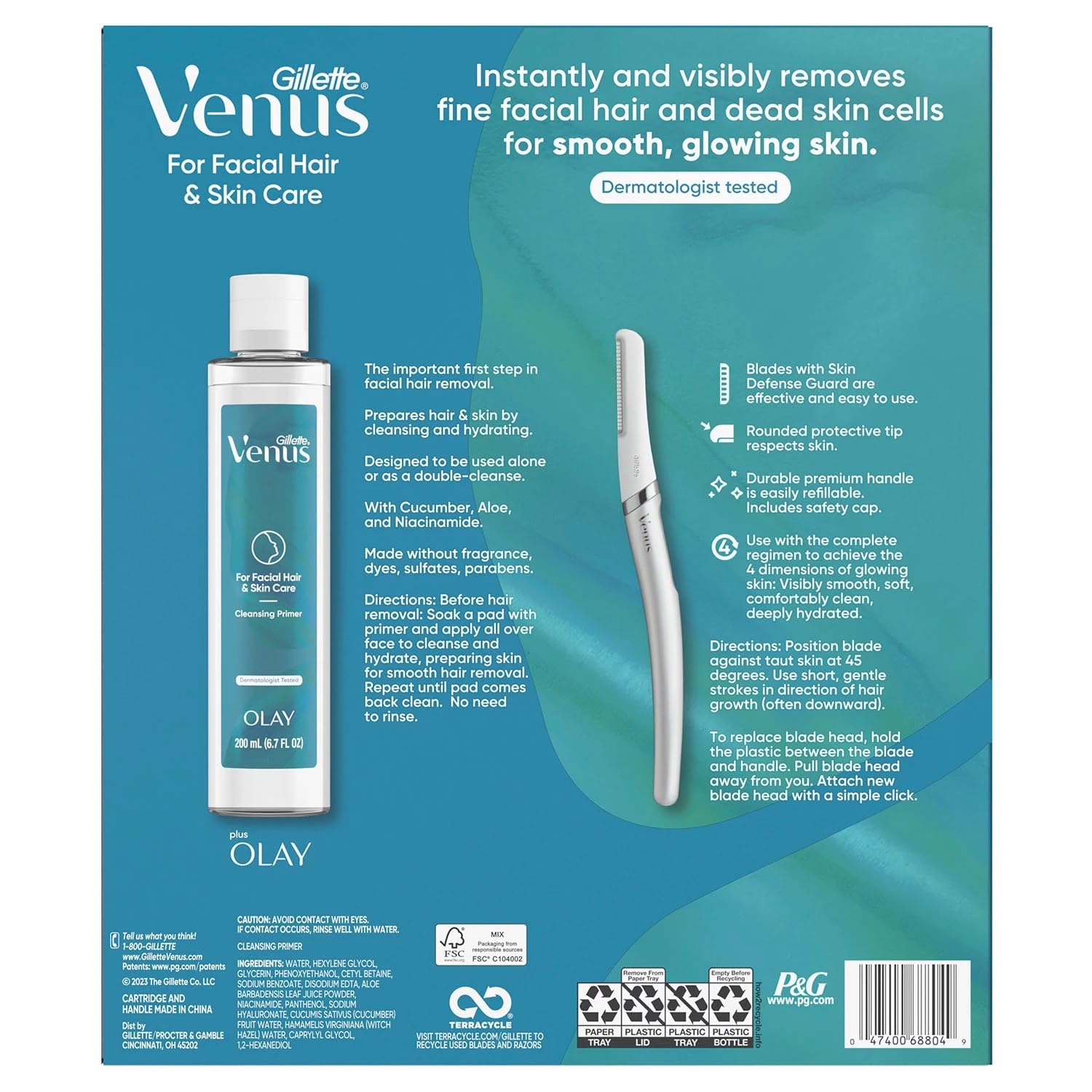 Say "buh-bye" to any unwanted facial hairs and "hello" smooth glowing skin with the Venus for Facial Hair andamp; Skin Care Dermaplaning Face Razor for women. Our facial hair remover starter kit comes with one refillable premium handle and 8 razor blades, so you can get spa-like smooth glowing skin from the comfort of home. This dermatologist-tested facial razor is easy to-use and designed to remove fine hair, dead skin cells, dirt, and oil. With our Skin Defense Guard and a protective rounded tip, these facial razor blades are designed to respect your skin, by helping protect it from shave irritation, nicks, and cuts. The durable, high-quality, weighted handle helps you achieve comfort and control. Our Venus face shaver handle is totally reusablesimply remove your used blade and click in the next one (we recommend swapping out every 3 uses). For an effective shave with less irritation, hold the skin taut with one hand, using the other hand to hold the facial razor at a 45-degree anglegently move the dermaplane razor in a downward direction. Venus complete line of products for facial hair removal for women sets you up for a smooth dermaplaning experiencesimply prep and cleanse with our Cleansing Primer before dermaplaning. This no-rinse facial cleanser removes stubborn dirt, makeup, and oils that other facial washes may have left behind, setting you up for a clean face before dermaplaning. For at-home dermaplaning, its the essential first step before facial hair removal. It preps skin for hair removal, but it also can be used daily as a double cleanse to help keep your skin feeling fresh and instantly hydrated in between dermaplaning facials. Our Venus Facial Cleansing Primer is dermatologist-tested and designed by the skin-loving experts at Olay.